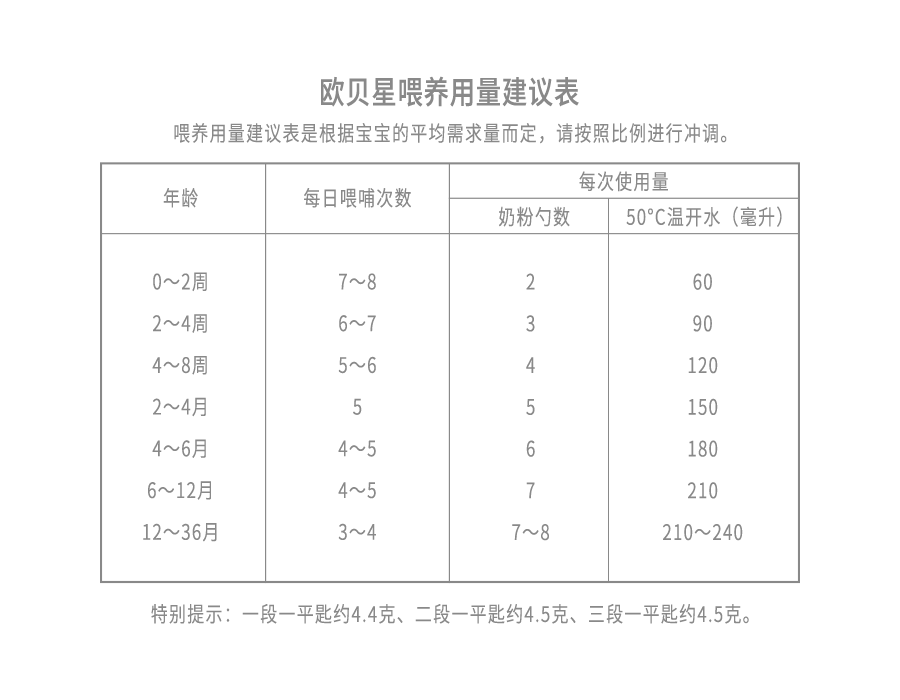 依照喂哺用量建議表,加入正確份量(平勺)的奶粉,請勿刻意壓平量勺。